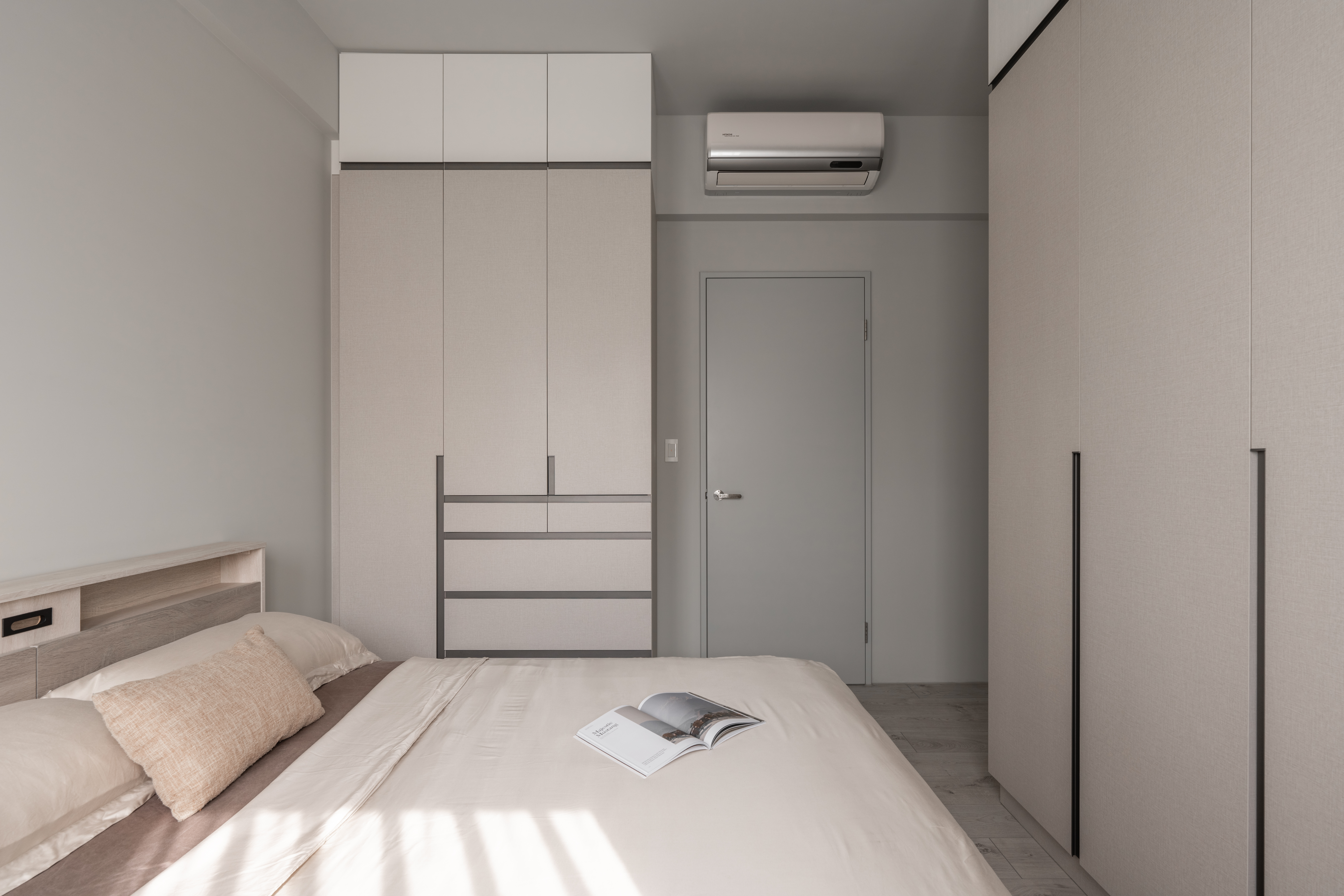 臥室延續了公共空間的寧靜感。溫暖的木質地板取代了磁磚,帶來更舒適的觸感和視覺溫度。牆面是柔和的淺灰色,搭配米白與淺棕色的寢具,營造出全然放鬆的睡眠環境。床頭板結合了置物平台和燈光,滿足閱讀與休憩的需求,設計簡潔實用。